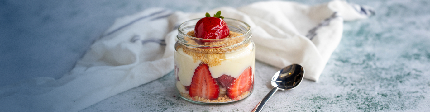 Muhallebi soğurken bebe bisküvilerini rondodan geçirin. Çileklerin saplarını çıkarın ve ince dilimler halinde kesin.